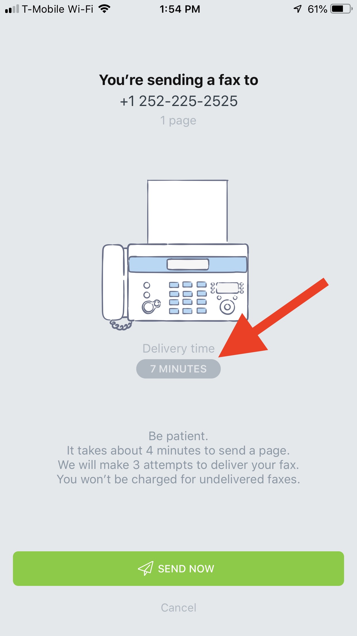 Beachten Sie, dass unser Faxdienstleister 3 Versuche unternimmt, ein Fax zuzustellen. Wenn Ihr Fax mehr als einen Versuch zum Senden benötigt, folgt jeder Versuch der gleichen Zeitschätzung, die wir oben beschrieben haben.