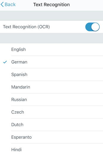 Text Recognition January 08, 2026 15:47 Updated Follow Set a language for Optical Character Recognition (OCR).From the Settings menu, select Text Recognition. Turn on OCR using the radio button and select the language. Related articles File Name Templates Merge scans Default E-mail App Default Page Size File Size and Quality