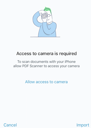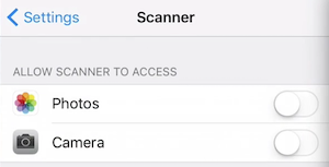 Se requiere permiso para que la aplicación Scanner acceda a las funciones de la cámara del iPhone. Antes de capturar imágenes con la cámara, se debe permitir el acceso. Si aún no se ha concedido el permiso, la aplicación indicará el problema.