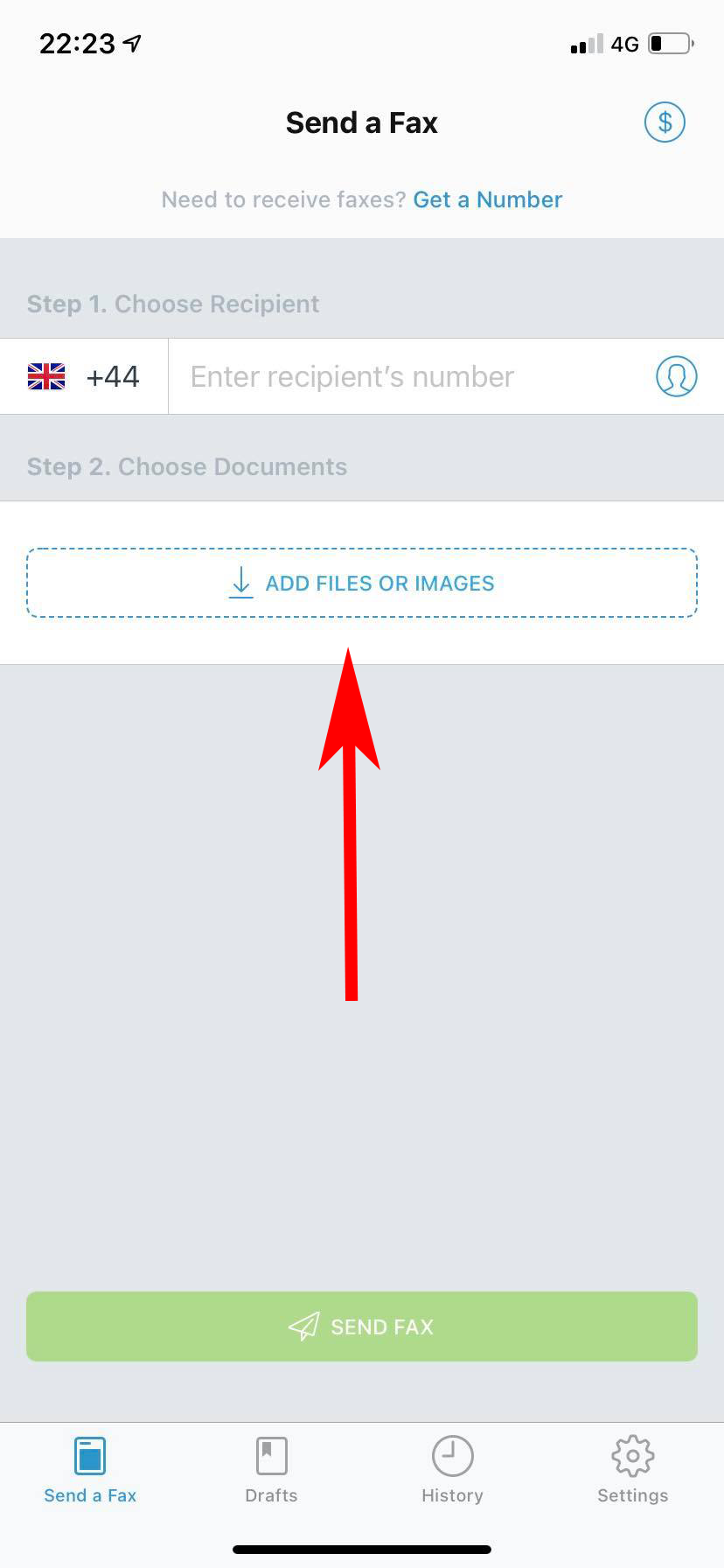 1. En el paso 1 de la pantalla de inicio Enviar un fax, toque el icono de la bandera.