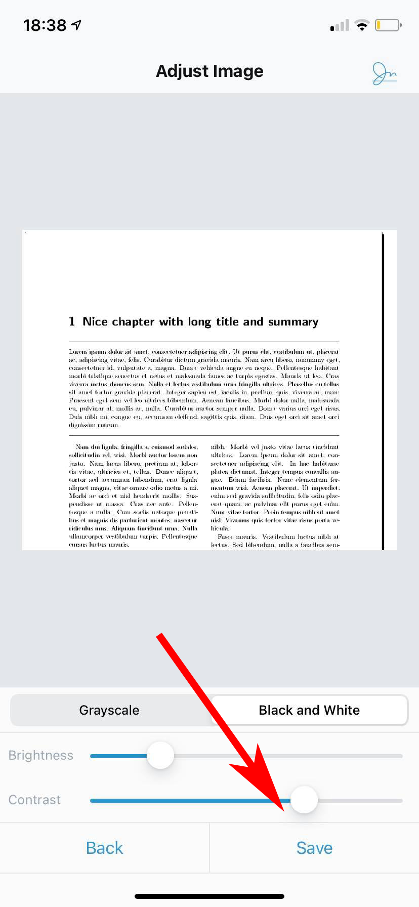 7. Seleccione Escala de grises o Blanco y negro para su documento y use los controles deslizantes para ajustar aún más la imagen a través de Brillo y Contraste.
