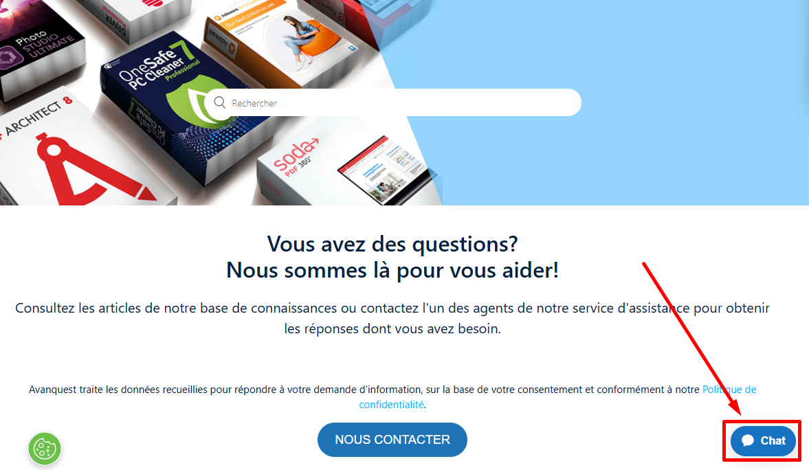 - Cliquez sur le bouton « Chat » en bas à droite de la page pour ouvrir la fenêtre de discussion.