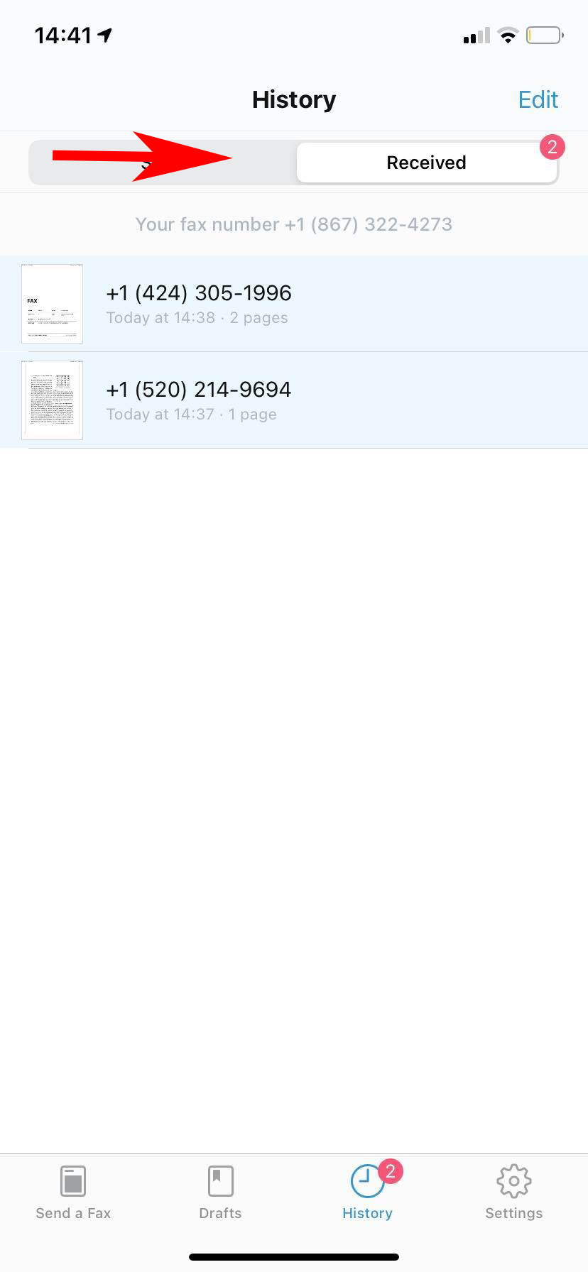 2. Selezionare la scheda Ricevuti nella parte superiore della pagina. Verrà visualizzata una notifica quando si riceve un nuovo fax.